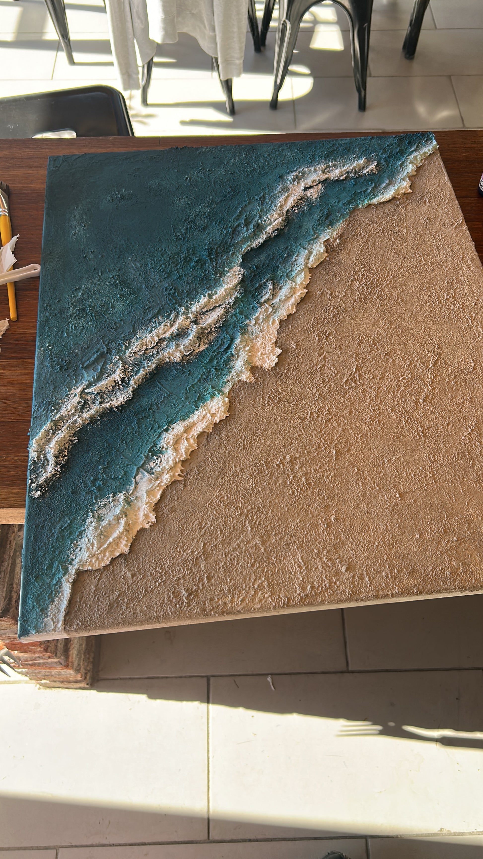 Obra en relieve que representa la unión entre mar y tierra, trabajada con texturas que aportan realismo y movimiento. Los tonos arena contrastan con el azul profundo del océano, mientras las crestas blancas de las olas parecen avanzar con energía sobre la superficie.